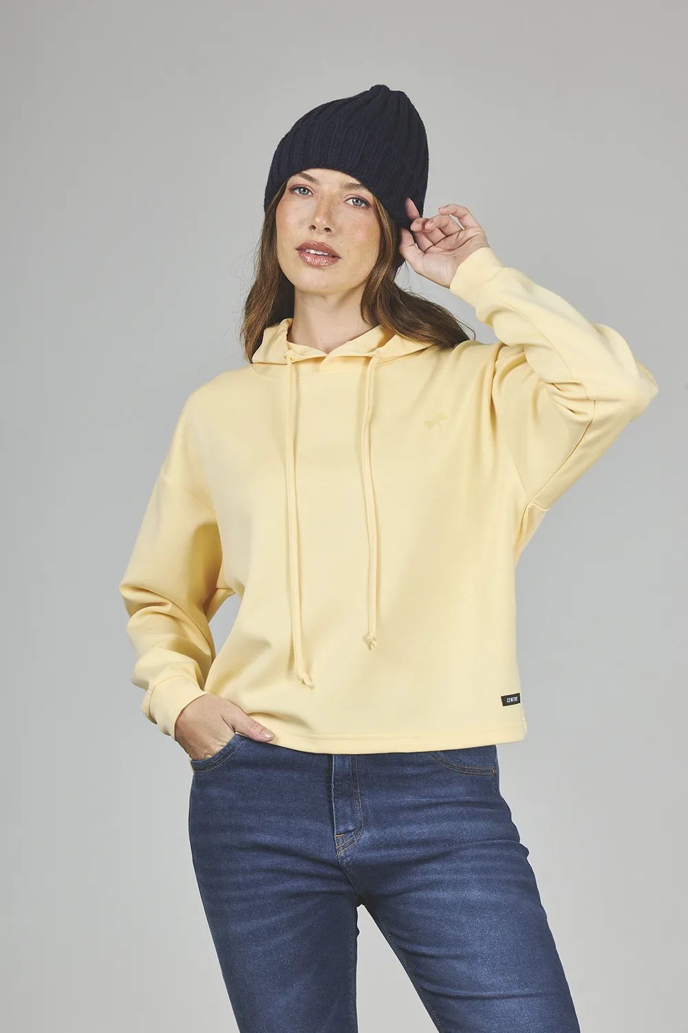 - BUZO CROP AMARILLO CON CAPUCHA LIBELULA